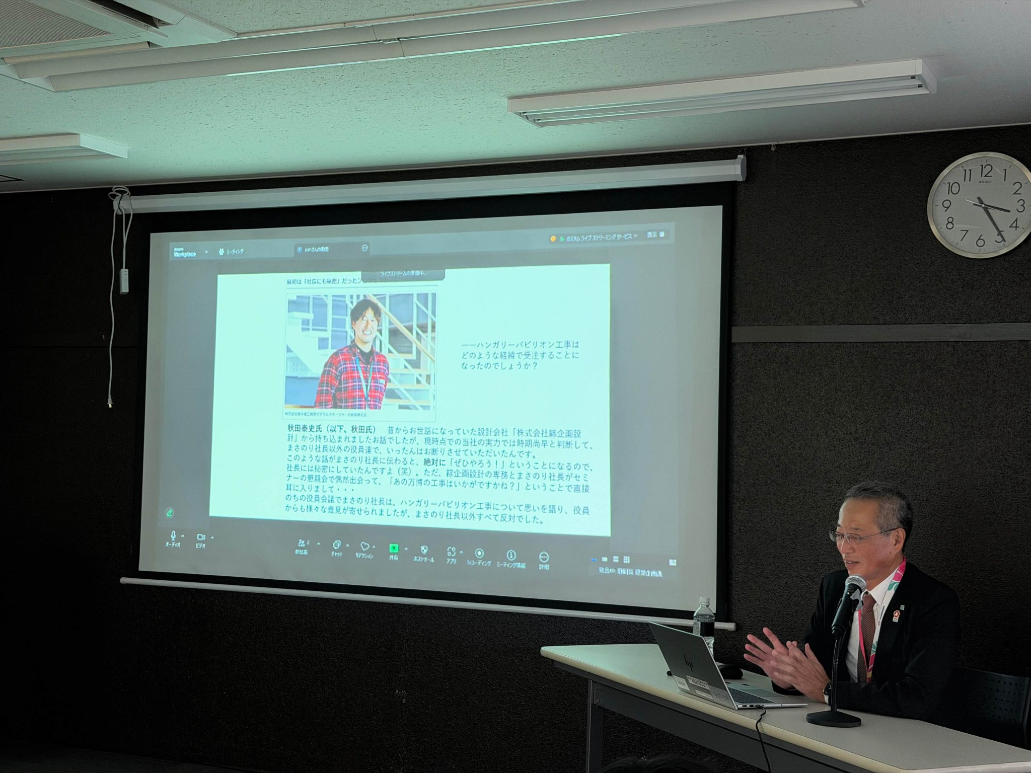 代表の橋本は、「公共建築の日」記念講演にて、大阪・関西万博ハンガリーパビリオンの建設に携わった経験をもとに、公共建築を通じた国際発信や建設業の役割について講演しました。国内外のプロジェクトに関わる中で得た視点や、ものづくりへの想いが語られました。